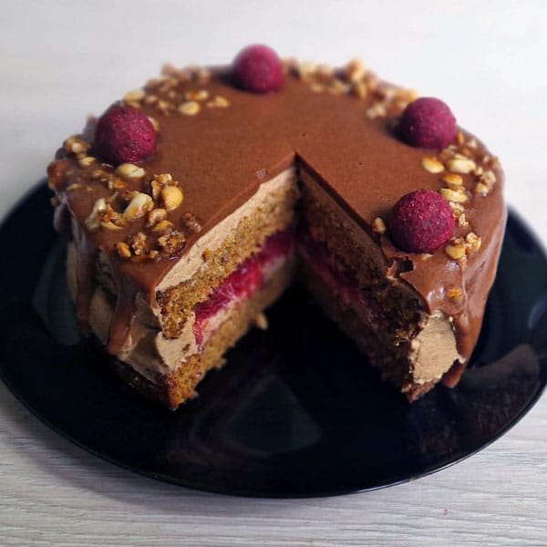 Burkānu torte ar brūklenēm un karameļu krēmu