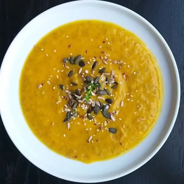 Ķirbja-seleriju biezzupa ar ingveru un čia sēklām